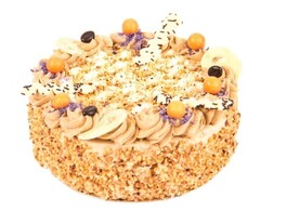 ± 18-20 personen. Moskovisch gebak gevuld met slagroom en een dun laagje abrikozenmoes, afgewerkt met witte crème en kinderversiering. Tussen de 3 lagen zit goudkarton ter versteviging.